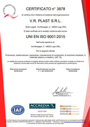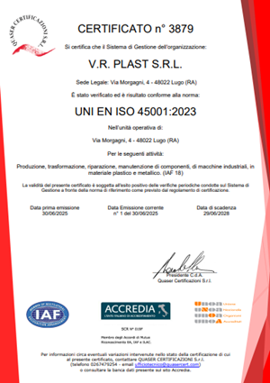 VR Plast è un’azienda certificata secondo gli standard internazionali UNI EN ISO 9001 (Qualità) e UNI ISO 45001 (Salute e Sicurezza sul Lavoro), a conferma del nostro impegno costante per l’eccellenza, l’affidabilità e la tutela delle persone.